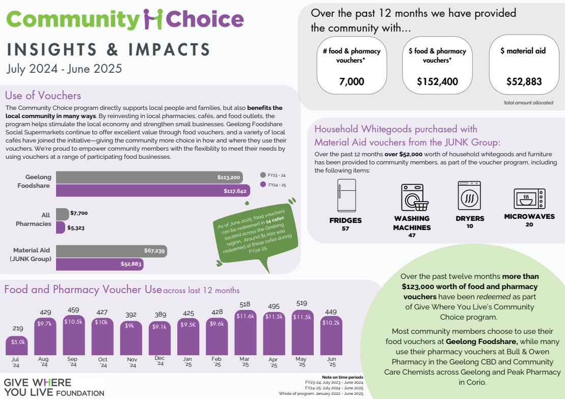 With support from the Percy Baxter Foundation and Shine On Foundation, (and in 2025, the Dawn Wade Foundation and Victorian Government Emergency Food Relief Grant) the Give Where You Live Foundation distributes around $210,000 annually through the Community Choice program, supporting over 10,000 people each year.